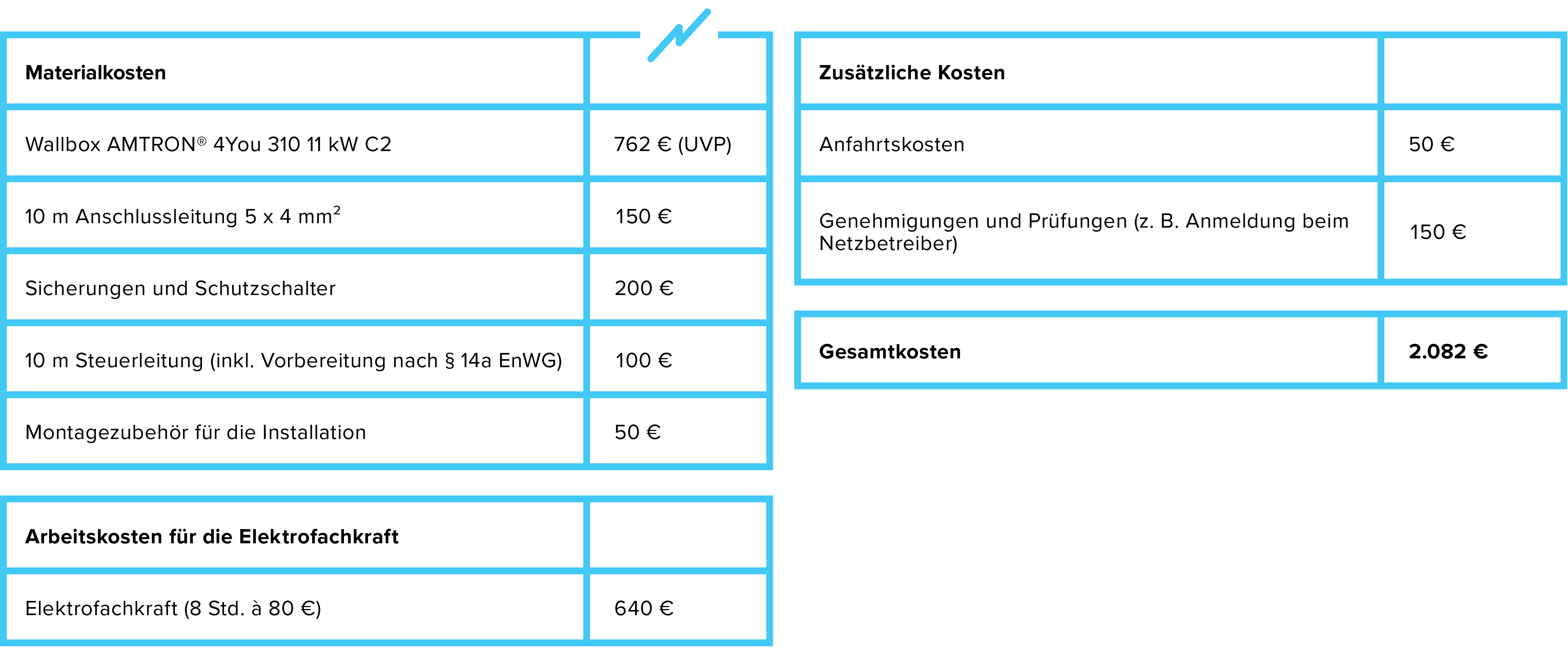 Die Installationskosten hängen stark von deinen Gegebenheiten vor Ort ab – etwa der Entfernung zum Sicherungskasten, dem Zustand der Stromleitungen oder ob Wanddurchbrüche nötig sind. Die Preise für MENNEKES Wallboxen der Serie AMTRON® 4You variieren je nach Modell und Ausstattung – sie liegen typischerweise zwischen ca. 650 € und 1.100 € (UVP). Damit du eine Orientierung erhältst, welche Kosten bei der Wallbox-Installation auf dich zukommen, zeigen wir dir ein konkretes Beispiel: